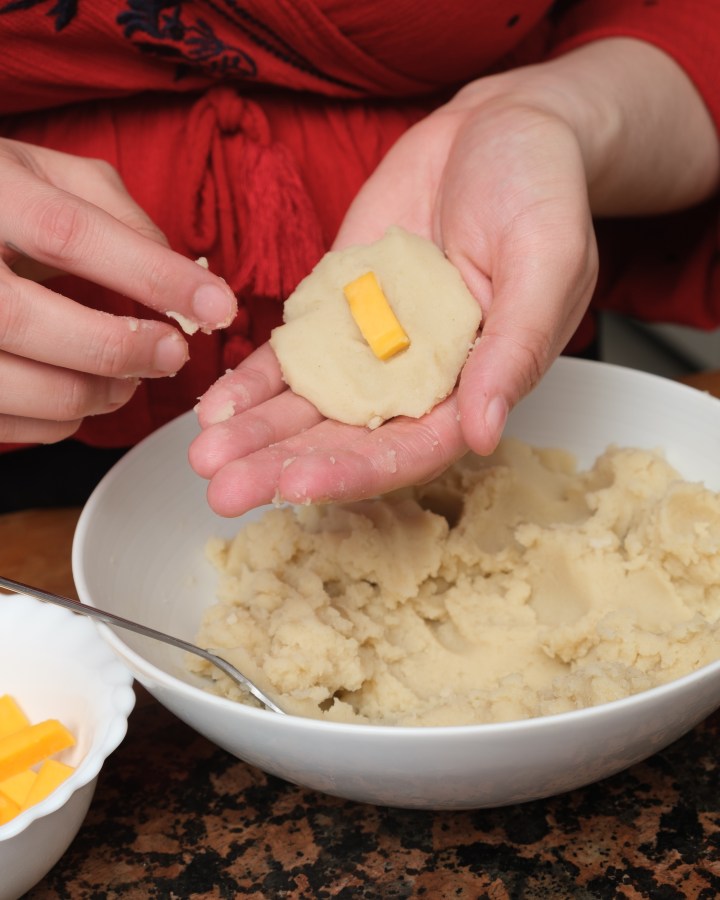 Crack 2 eggs in a plate and whisk together, set aside. Then in a separate bowl add the potato flakes and flour (50 percent flakes and 50 percent flour). Season both the egg mix and flour mix with same spices you used in the mashed potatoes. Before you start the next step, make sure the mashed potatoes have cooled down enough so the cheese won’t melt instantly. Add a cube of cheese in the middle of each croquette.